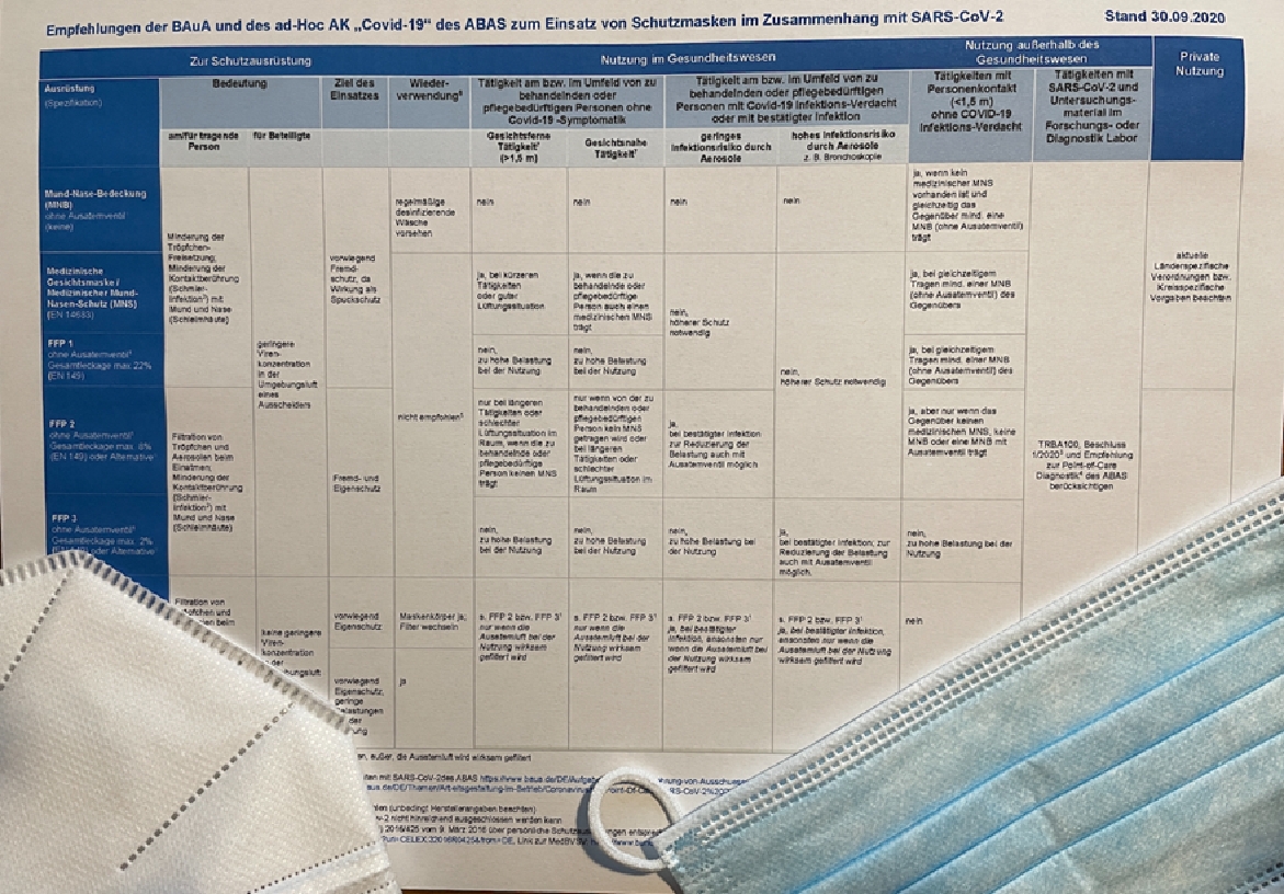 Einfache Mund-Nase- Bedeckungen sog. Community Masken und medizinische Gesichtsmasken sog. OP-Masken dienen in erster Linie der Minderung einer Tröpfchen Freisetzung und der Minderung der Kontaktberührung mit Mund und Nase. Sie dienen vorwiegend dem Fremdschutz anderer Personen. Während FFP Schutz-Masken ohne Ausatemventil sowohl dem Eigenschutz- als auch dem Fremdschutz dienen. Eine Übersicht der Schutzmasken und der Nutzung innerhalb und außerhalb des Gesundheitswesens ist auf der Homepage der Bundesanstalt für Arbeitsschutz und Arbeitsmedizin zu finden.