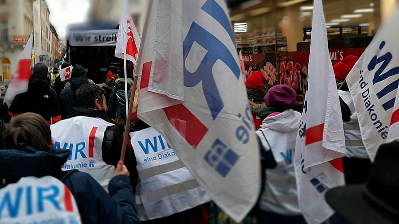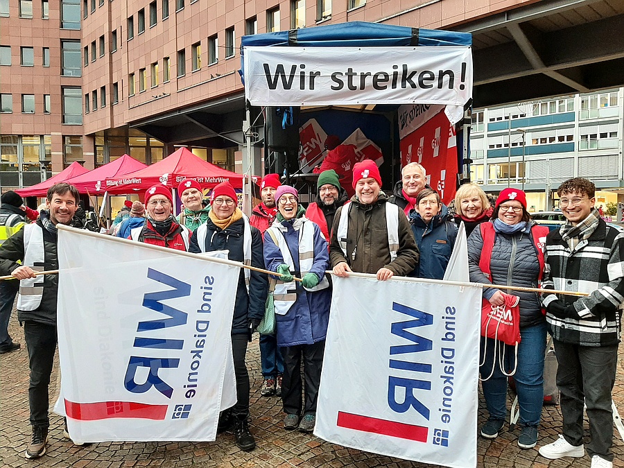 Sie haben es tatsächlich getan: angestellte Lehrkräfte aus 5 diakonischen Schulen waren in Karlsruhe dabei und haben gestreikt. Sie sind dem Streikaufruf der Gewerkschaft GEW gefolgt und waren gemeinsam mit ca. 1.000 Kolleg:innen auf der Straße beim bundesweiten Bildungsstreiktag der GEW in Karlsruhe. Andere haben sich über Fotos aus diakonischen Schulen auf der Leinwand im Streiklokal zugeschaltet und sich solidarisch mit den Streikenden erklärt, und teilweise auch selbst mitgestreikt