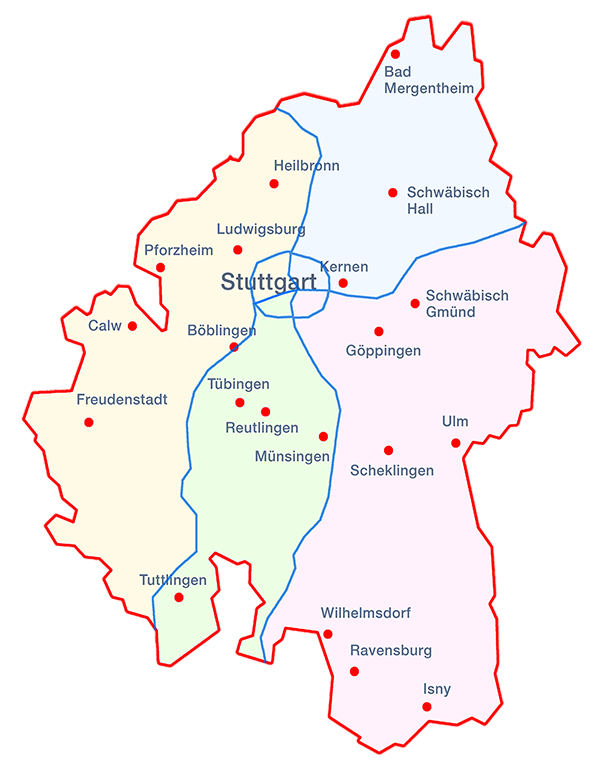 Die AGMAV Regionalversammlungen sind im Bereich der württembergischen Landeskirche in vier Regionen aufgeteilt.