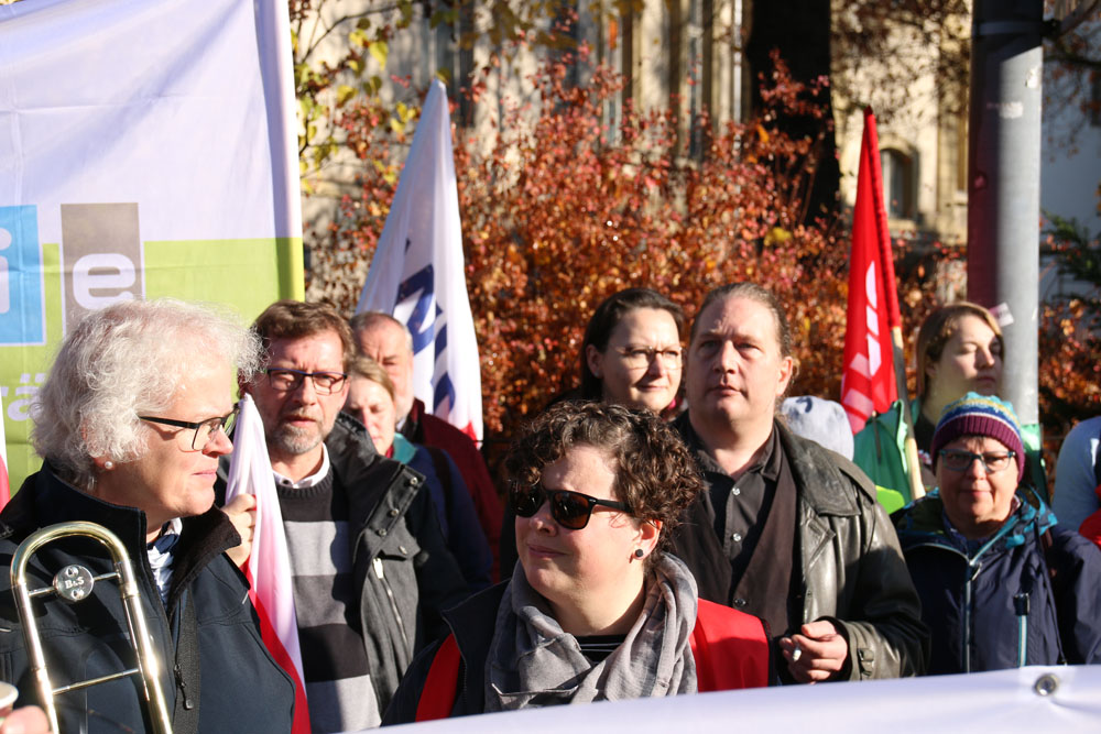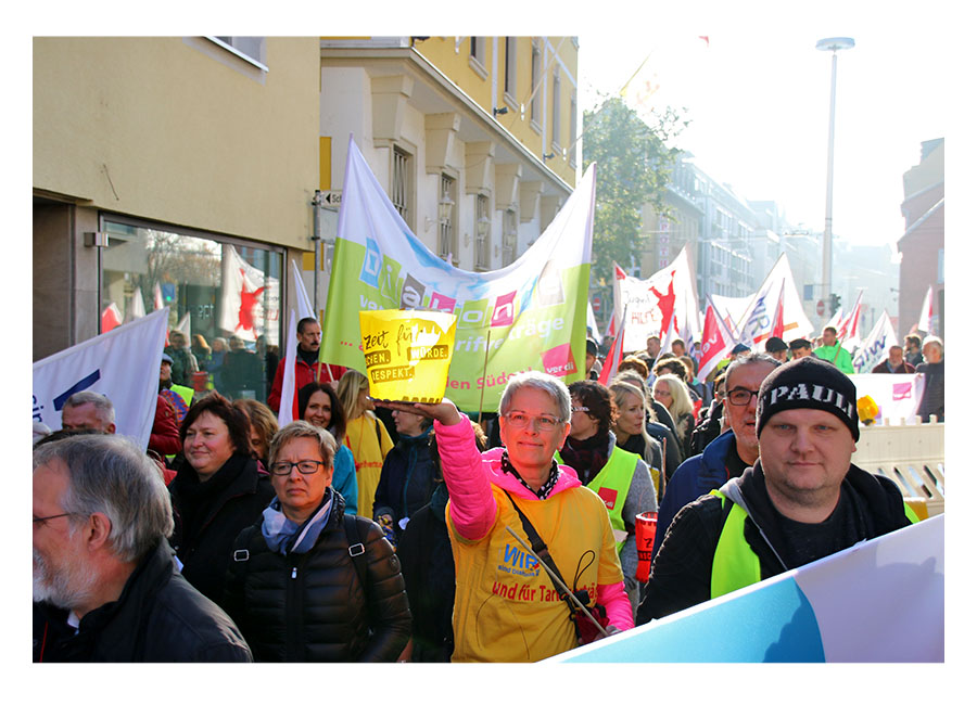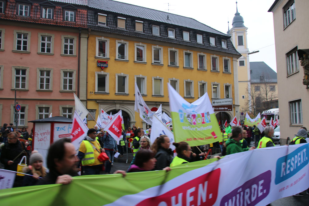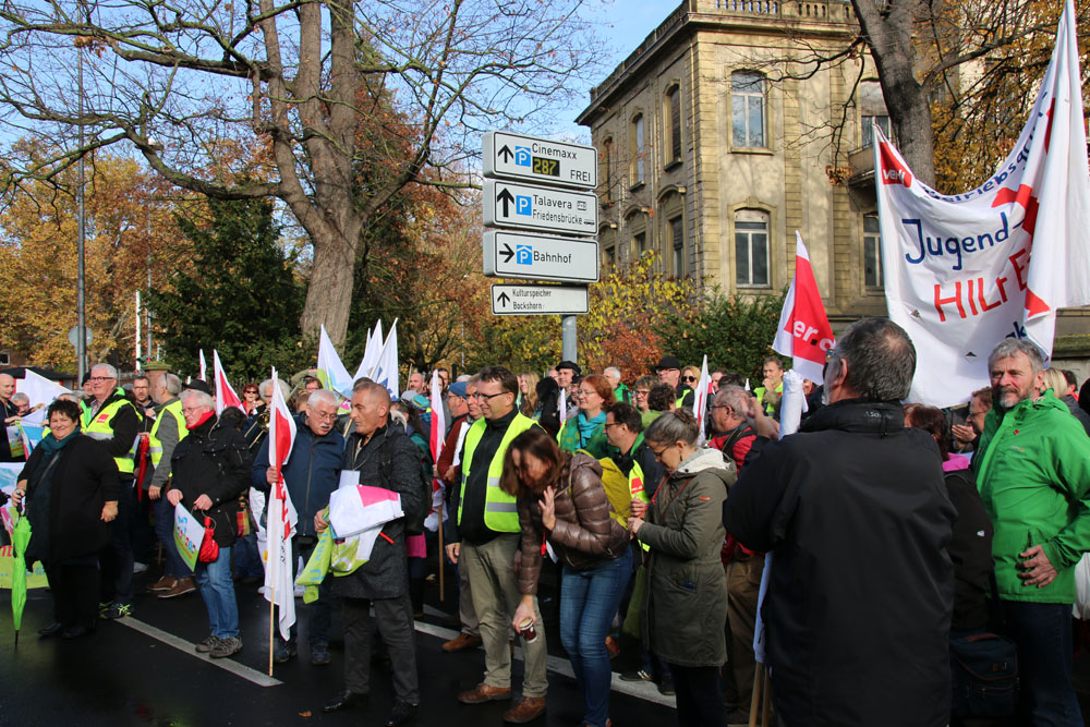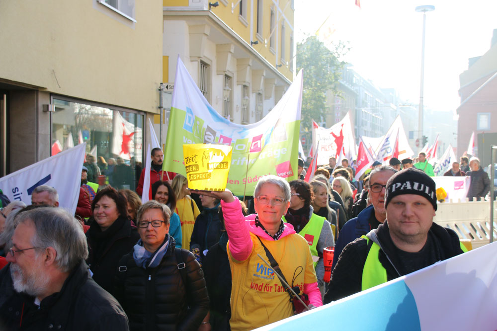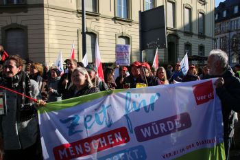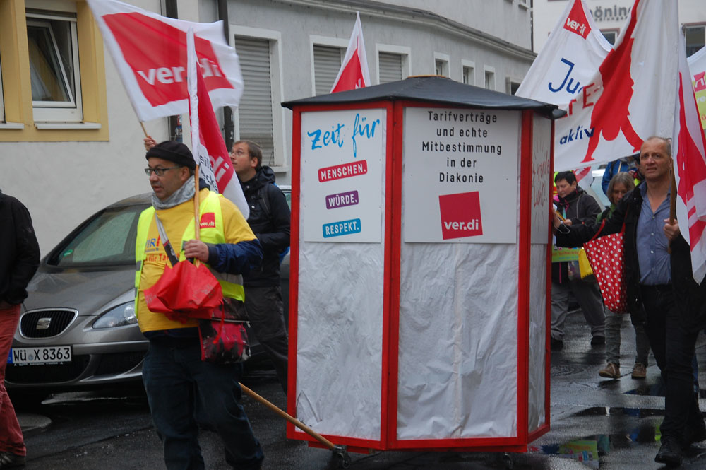 der geplanten MVG-EKD-Novellierung mit den Forderungen der ArbeitnermervertreterInnen auseinanderzusetzen. Unsere Aktion unter der Organisations- leitung von ver.di war ein voller Erfolg! Bereits vor Beginn des Eröffnungsgottesdienstes räumte die Präses der Synode der Evangelischen Kirche, Irmgard Schwaetzer, in einem Exklusiv- interview ein, dass die Arbeitnehmerinte- ressen ernst genommen werden würden und der Entwurf an einigen Stellen noch eine Verbesserung erfährt. So insbesondere bezüglich den im Entwurf vorliegenden Verschlechterungen bei der Mitbestimmung bezüglich Einigungsstellen würde die Kennzahlen nach unten korrigiert. Sie betonte abschließend anerkennend, dass es ein besonderes und wichtiges Zeichen in unserer Demokratie sei, wenn sich so viele Menschen am frühen Sonntagmorgen hier im strömenden Re- gen versammeln. Lautstark sind wir durch Würzburg von der St. Stephanskirche zum Tagungsort der Synode gezogen und haben demonstriert: