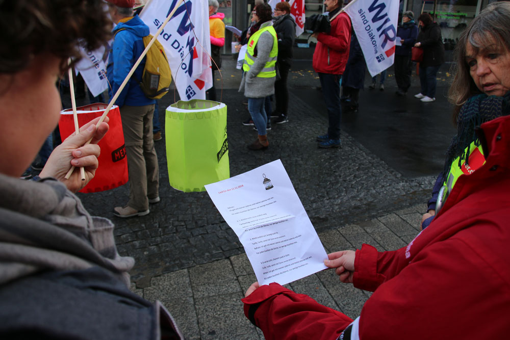 württembergische Kollegin Hilde Erhard eine knackige Rede gehalten: schwäbisch, herzlich, und auf den Punkt gebracht! Der Beifall der mehr als 120 Kolleginnen und Kollegen aus Würt- temberg war entsprechend riesig. Auch der "Onkel des MVG" wie sich Herr Detlev Fey, Oberkirchenrat bei der EKD und Leiter des Referates für Arbeitsrecht selber bezeichnet, stellte Änderungen des derzeitigen Geset- zesentwurfes zum MVG vor der Verabschiedung in Aussicht, als er vor den Versammelten sprach. Mit einer hoffnungsvollen Laolawelle endete die Kundgebung.