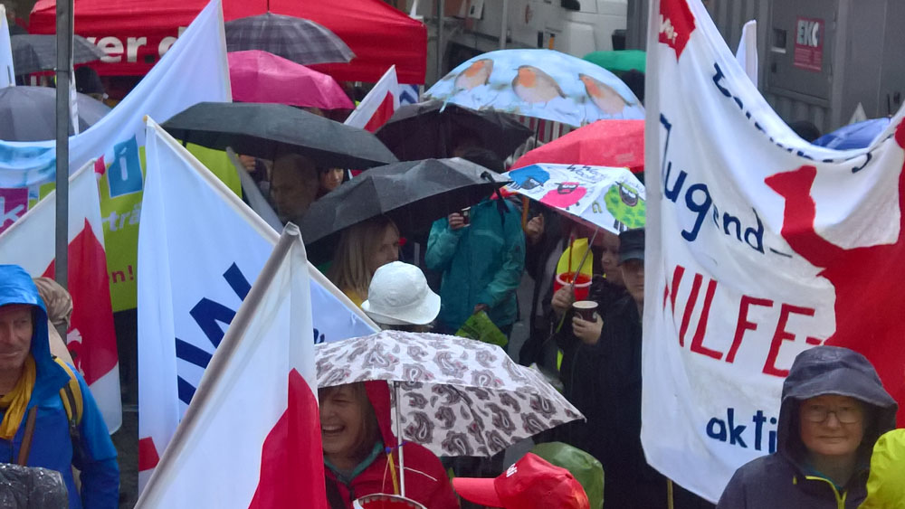 haben sich am frühen Sonntagmorgen bei strömenden Regen vor der St. Stephan-Kirche in Würzburg versammelt, um gegen die geplanten Verschlechterungen des MVG der Evangelischen Kirche Deutschland zu protestieren. Ein Drittel kam allein aus Württemberg! Dafür ein herzliches Dankeschön und kräftigen Applaus all diesen engagierten Kolleginnen und Kollegen!!