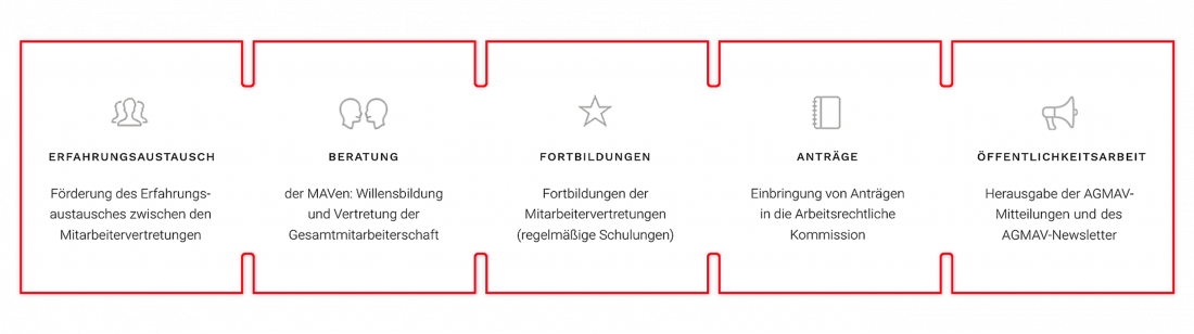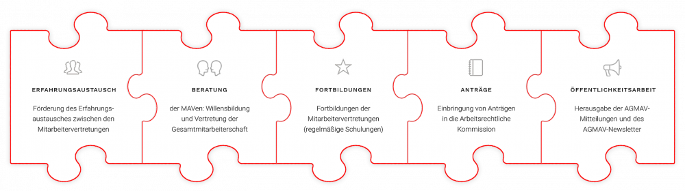 Die Mitarbeiter*innen der Geschäftsstelle unterstützen den AGMAV-Vorstand bei der Planung und Durchführung seiner Aufgaben, insbesondere bei der Erarbeitung von Vorlagen an die Arbeitsrechtliche Kommission sowie bei der Beratung und Information der Mitarbeitervertretungen der Mitgliedseinrichtungen des Diakonischen Werks Württemberg in ihren Aufgaben, Rechten und Pflichten.